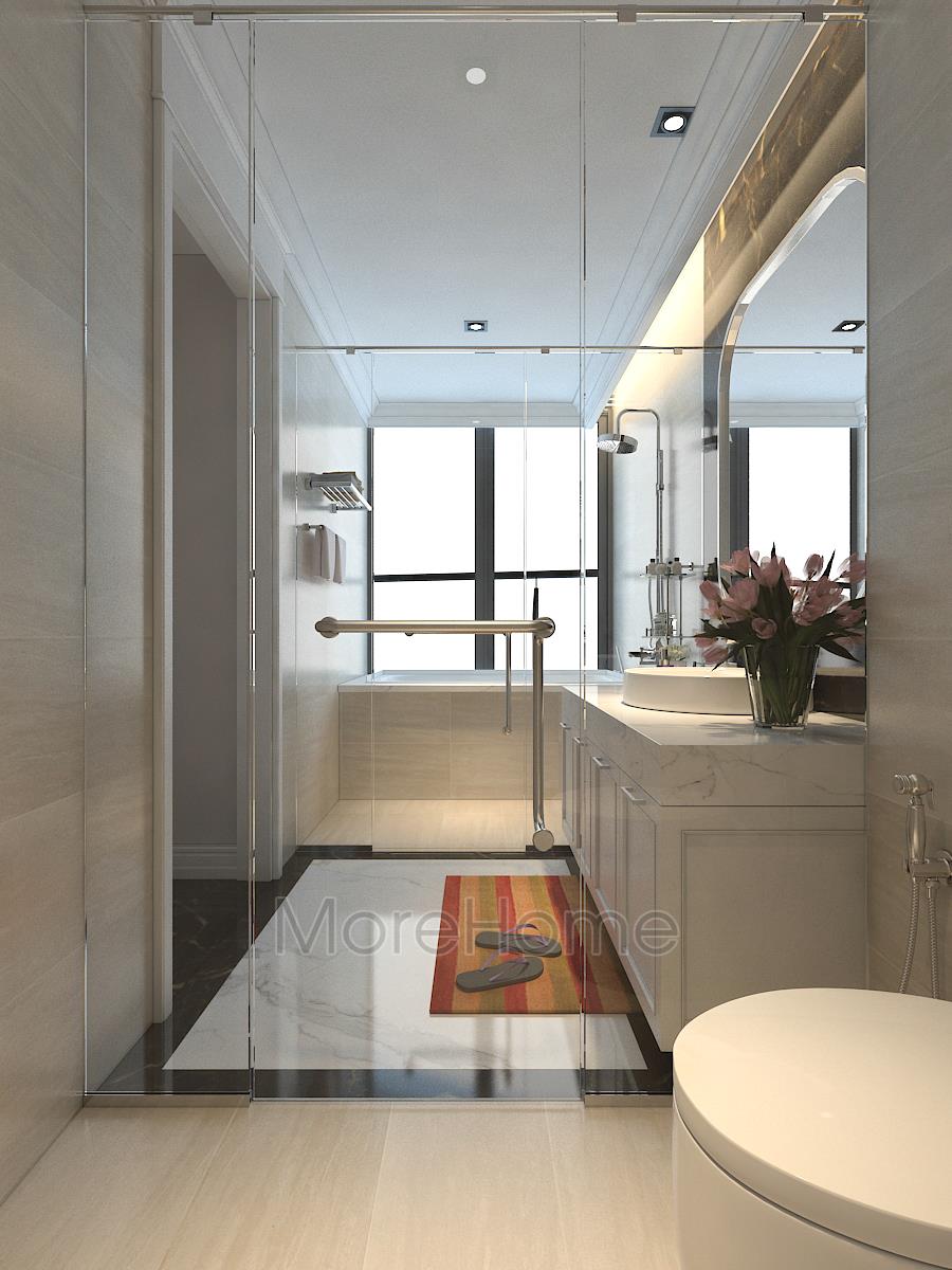 Tiếp theo là không gian phòng tắm + vệ sinh của khách sạn: thiết kế nội thất phòng tắm nhỏ đẹp với vách tắm kính cường lực cao cấp nhằm phân chia không gian rõ ràng mà không bị gò bó. Sử dụng các thiết bị về sinh tiện nghi cao cấp màu trắng sáng rất tiện nghi, sang trọng và hiện đại. Đây là một không gian nghỉ ngơi, thư giãn lí tưởng cho khách hàng.