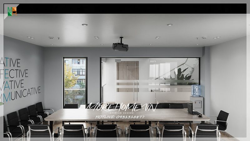 Bộ bàn ghế văn phòng được đặt vị trí chính giữa giúp không gian phòng họp trở nên đẹp và ân tượng hơn.
