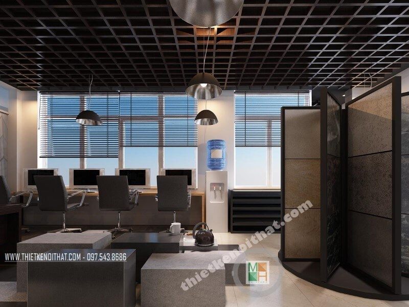 Mẫu thiết kế nội thất showroom văn phòng ấn tượng kết hợp với khutrưng bày đá tự nhiên độc đáo.