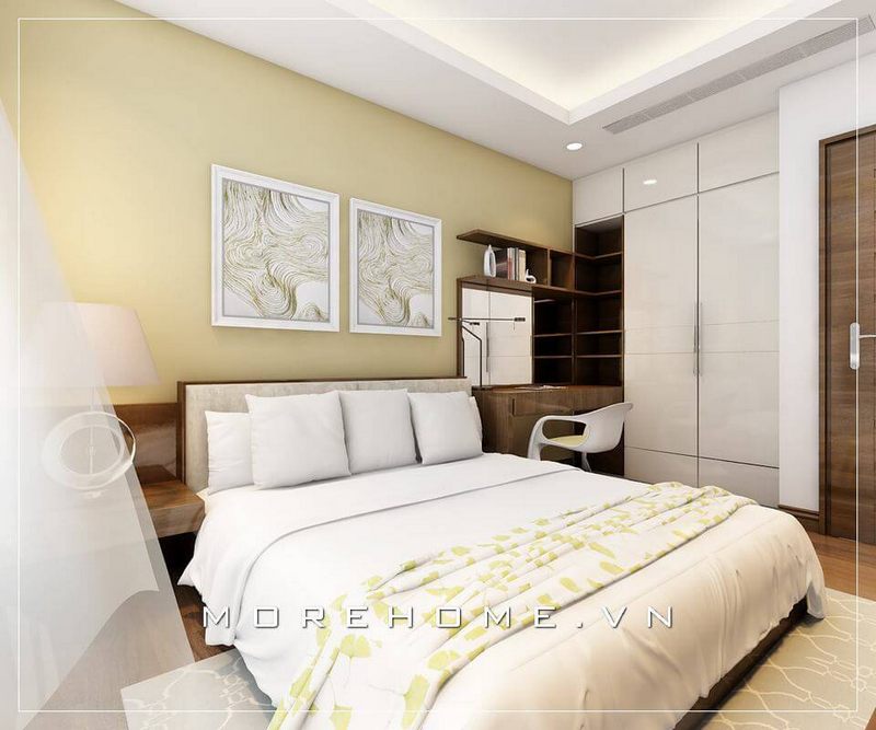Giường ngủ khách sạn được lựa chọn với chất liệu gỗ công nghiệp, tone màu nâu nhẹ nhàng mà thanh thoát tạo điểm nhấn cho cả căn phòng