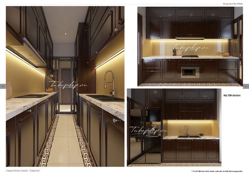 Cùng với tủ bếp gỗ tự nhiên sơn bóng, kính ốp bếp màu vàng nhạt kết hợp giúp tăng độ sáng và cho không gian nổi bật hơn